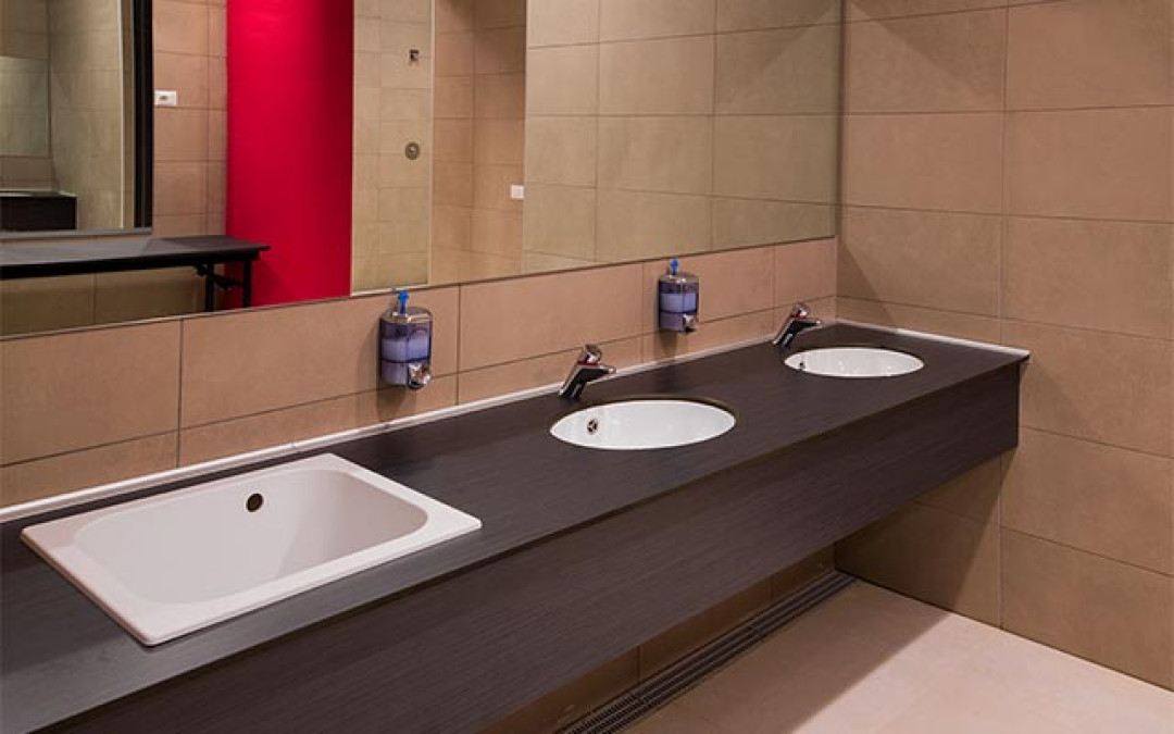 El tabique inferior de la estructura se fija en posición vertical. Los costados de terminación moldurados y las escuadras de refuerzo para las encimeras multilavabo también están realizados en HPL. La encimera consta de lavabo oval de acero, con instalación bajo la encimera o empotrado y sellado como corresponde.